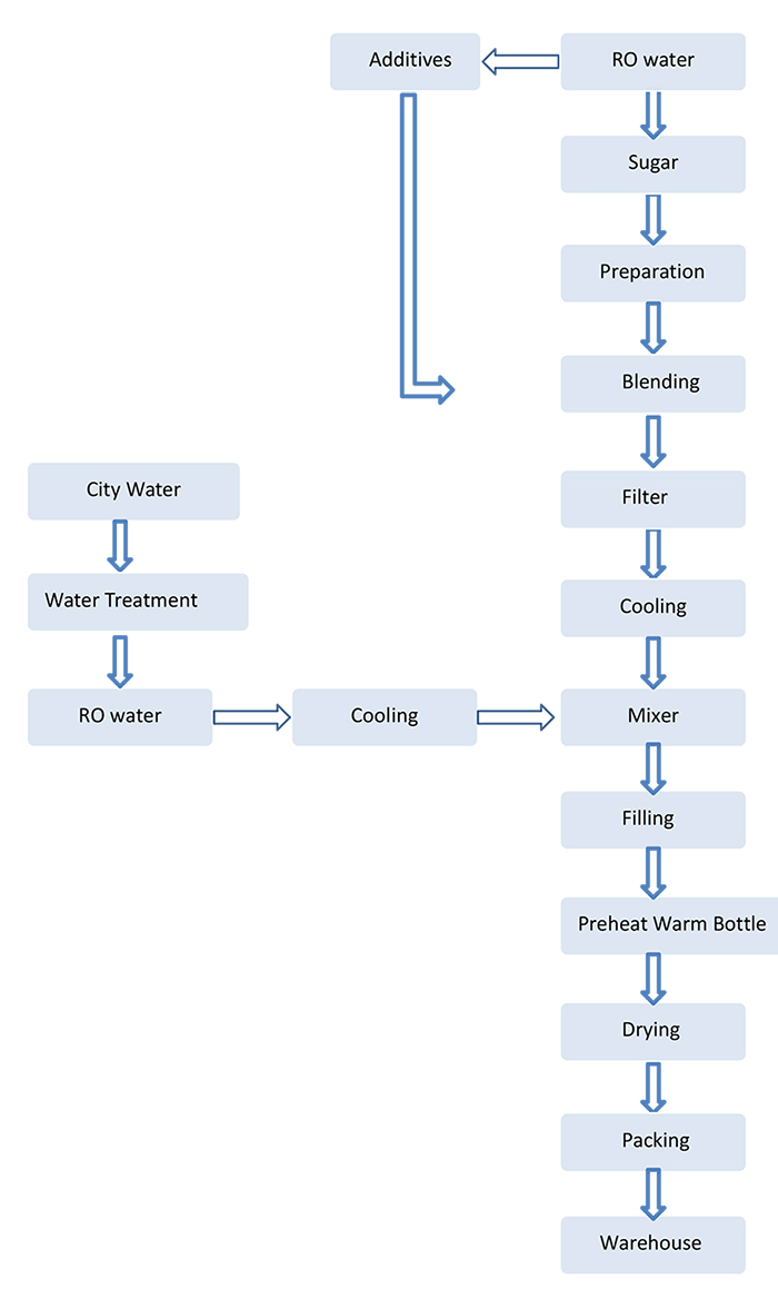 La línea de producción de bebidas carbonatadas está compuesta por el sistema de tratamiento de agua RO, el sistema de disolución de azúcar e ingredientes, el sistema de premezcla de dióxido de carbono y jarabe, sistema de llenado y empaquetado y sistema CIP.